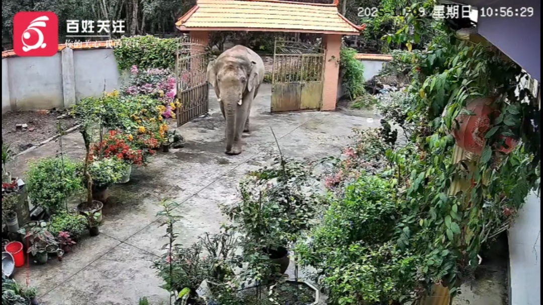 监控画面显示,大象用鼻子推开大门,走进院子,短暂停留后自行离开。