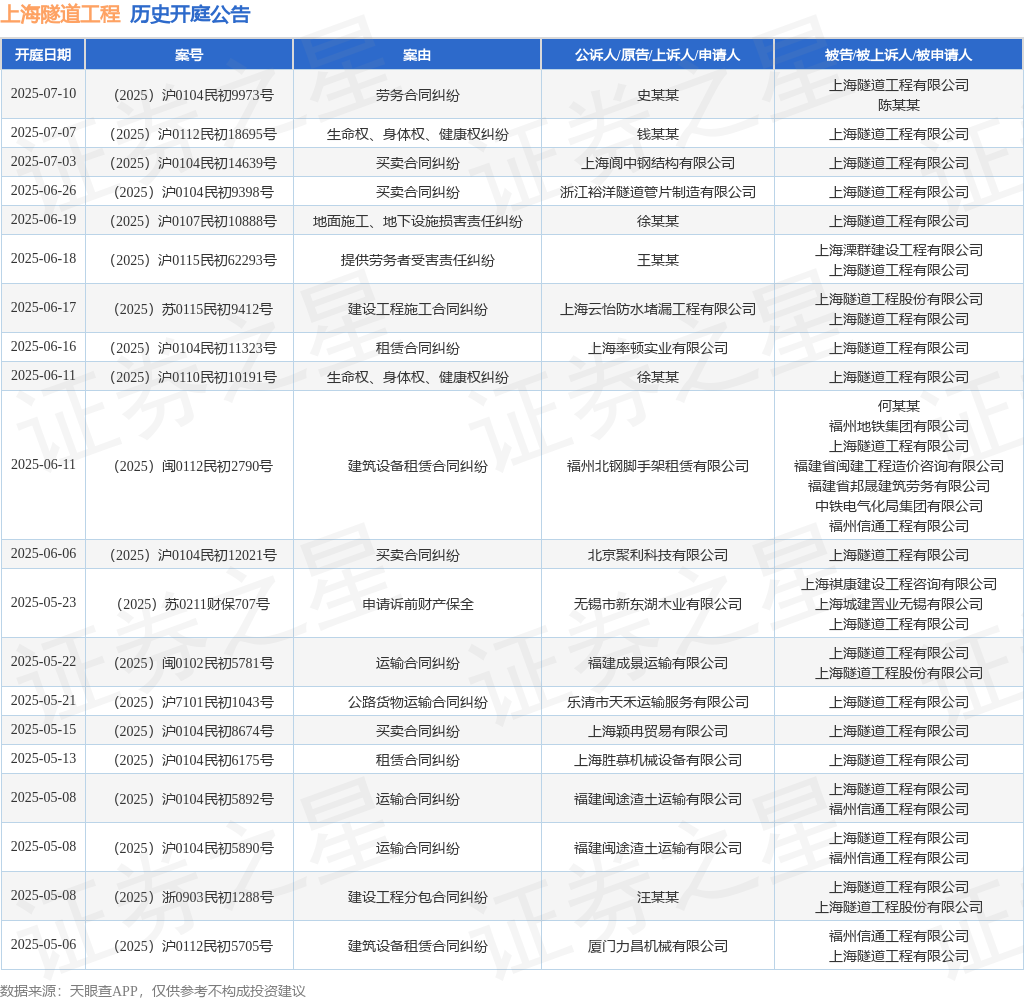 案号:(2025)苏0115民初9412号审理法院:南京市江宁区人民法院案由:建设工程施工合同纠纷当事人信息: 原告/上诉人:上海云怡防水堵漏工程有限公司 被告/被上诉人:上海隧道工程股份有限公司、上海隧道工程有限公司开庭日期:2025年6月17日根据统计,近一年内以上海隧道工程有限公司为当事人的历史开庭公告有96则,其中案由为“买卖合同纠纷”的公告以25则居首,其次为“建设工程分包合同纠纷”有11则,“租赁合同纠纷”有10则。历史开庭公告(前20条)如下: